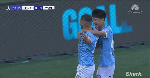 Tapped to start his first-ever A-League Men appearance with the hope that he would help restore some of the creativity lost with Andreas Kuen’s injury, Lawrence Wong, all of 17 years old, became the latest youngster to help carry the load. He flashed signs of promise and excitement before his day was brought to a premature end by cramping in his calf – the pratfalls of last playing a competitive game during the 2024 NPL season – and played a role in City’s opener; swinging in a 32nd-minute corner that Ben Mazzeo headed onto the post before it was turned in by Harry Politidis, his second goal in as many games.